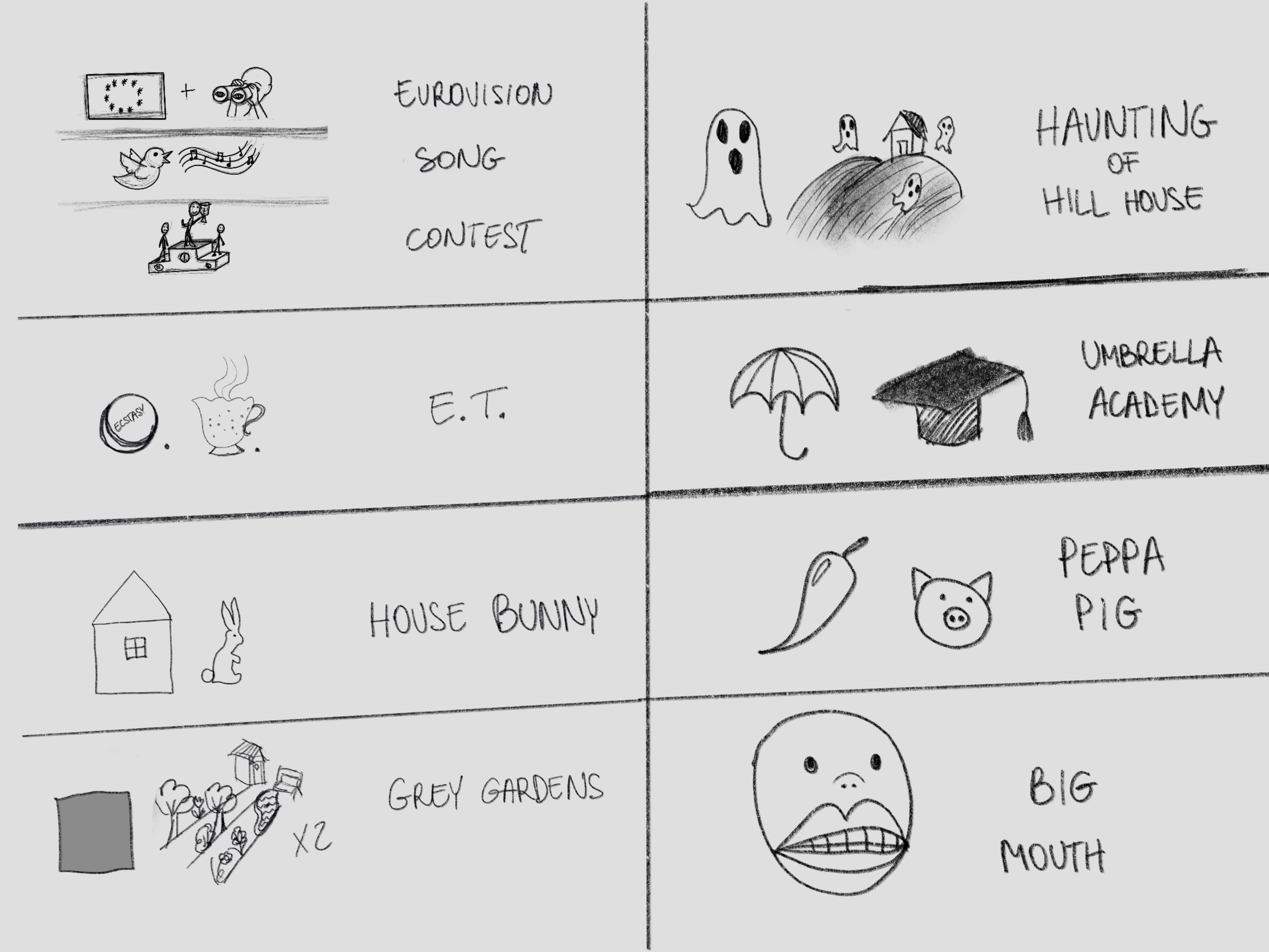 This exercise asked me to do some picture charades. I tried to communicate the names of tv programmes or films using drawings only.