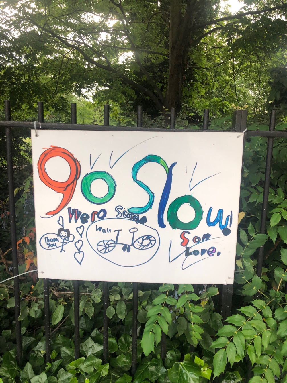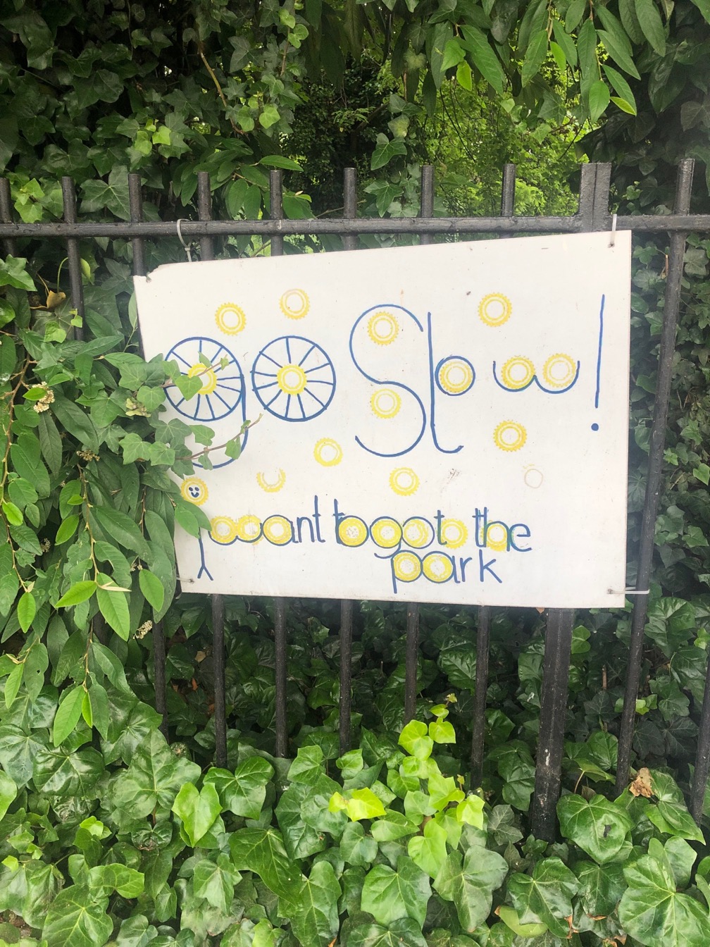 I found these signs near a park in Dalston. The signs are asking cyclists to slow down around the park as children might be crossing the road. The first one is definitely made by an older child, it looks pretty cool in my opinion. I like how wheels are used as part of the type. I am also interested to see that they used a very limited colour palette.
