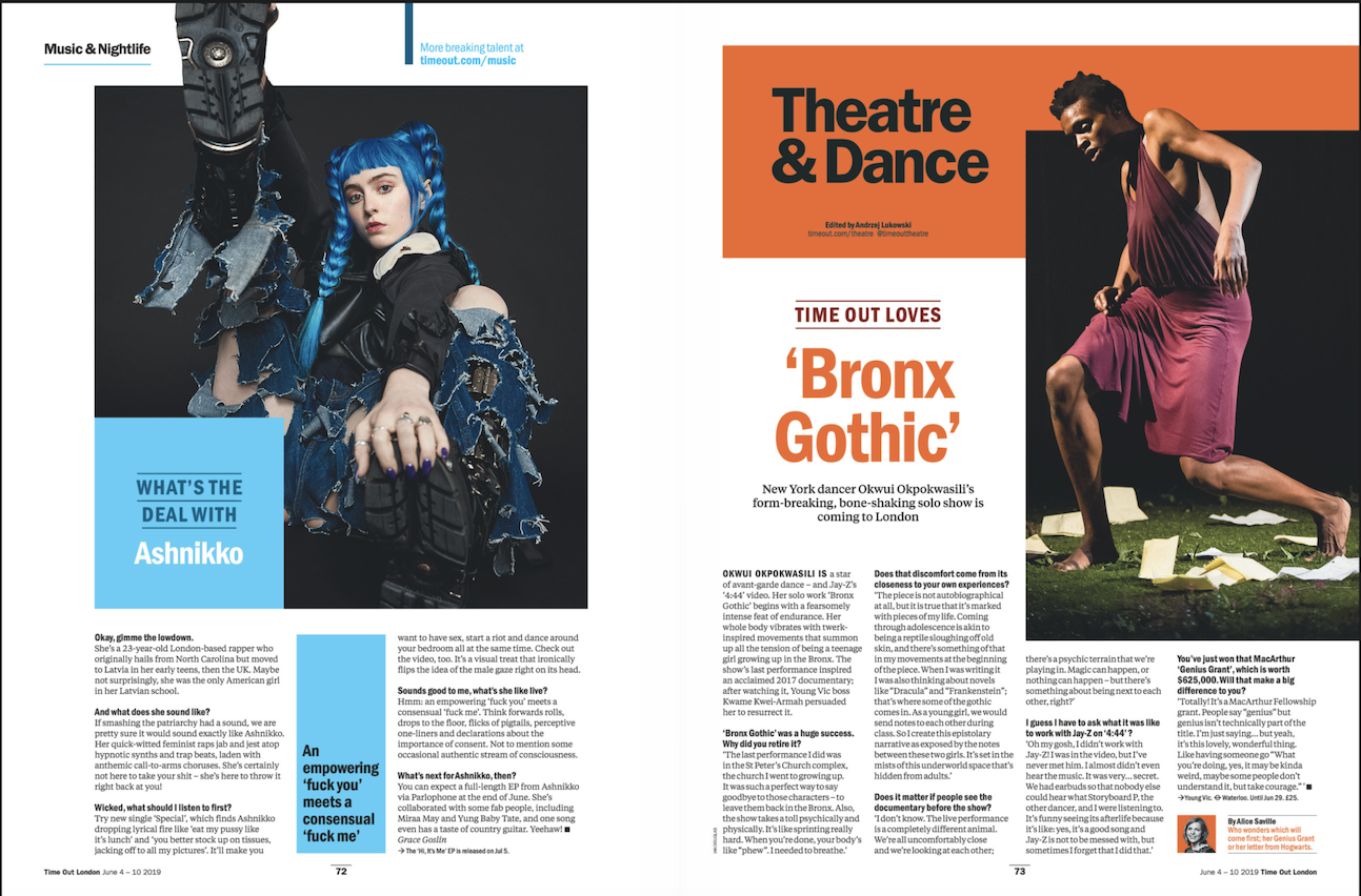 I collected this interview from the Time Out Magazine, I liked the use of the layout and colour. I liked how the pages have their colour identity that is harmonious both with each other and the subject in the pictures.