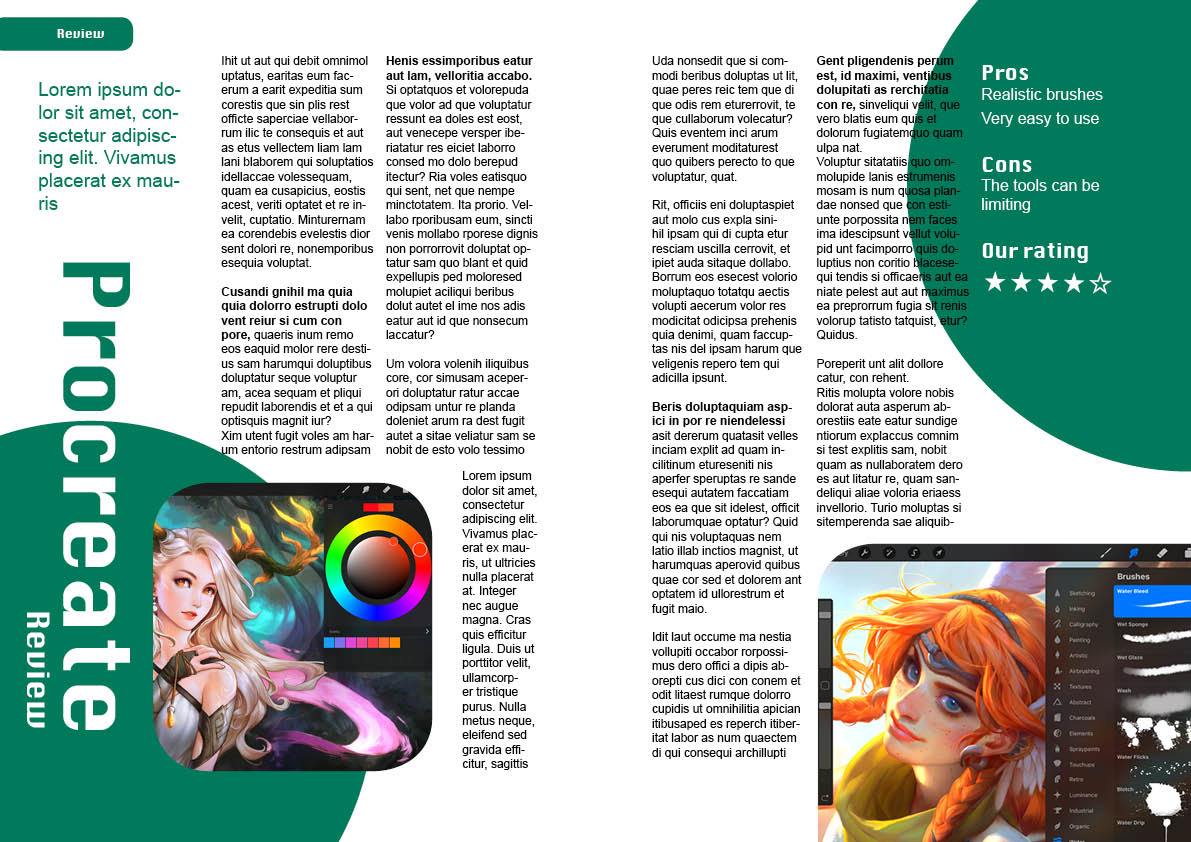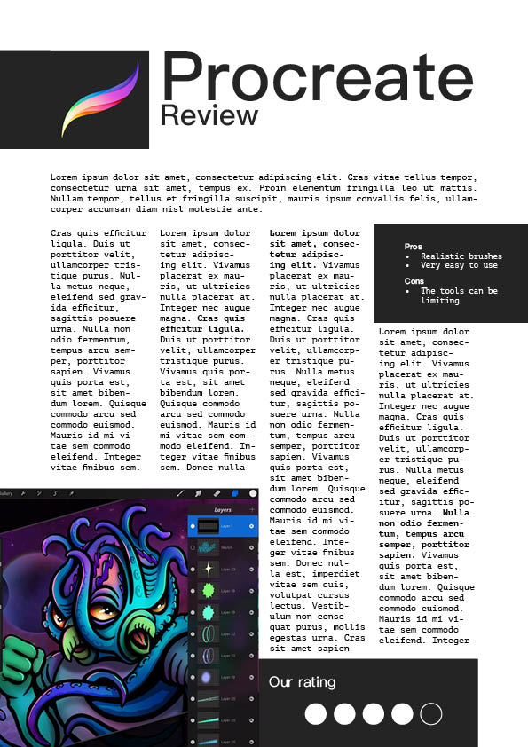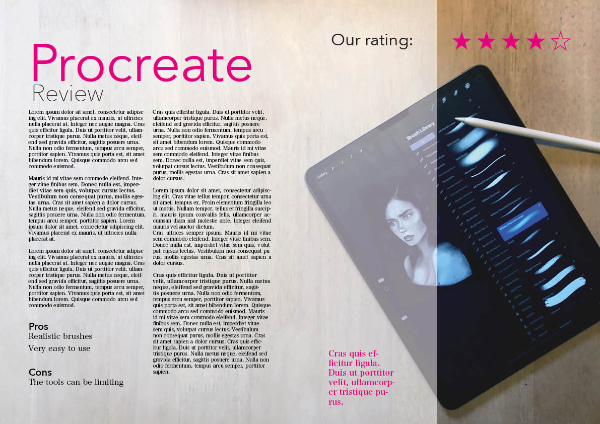 For my second design I taken a photo of my iPad with the Procreate app open and and laid it on the dining table for a more lifestyle kind of look. While I really liked the results, I feel like this might work better in something like a fashion magazine as it has a certain feminine look to it. I used a white overlay as the text was quite hard to read on the textured background in parts, and added the magenta colour to further emphasise the more important parts of the review. There is a callout text which would be something that summarises the article in a sentence, which the reader might want to read before reading the whole article.