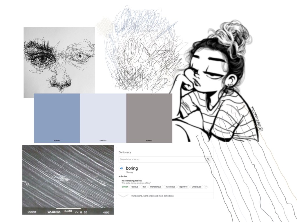 I found scribbles a very good way to show that feeling of being bored and stale, I think this is the mark I will want to use when creating my illustration. I went ahead and created the below mood board of marks, colours and some general doodles that convey the feeling.