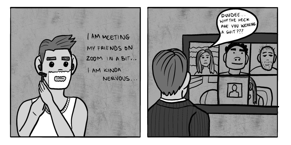 At the beginning of the pandemic, I have seen all of these videos and pictures pop up which were illustrating the mental state of people trying to cope with being isolated from their normal existence. I wanted to gather some of these images and see if I can put together a sort of collage that would help me come up with my comic.
