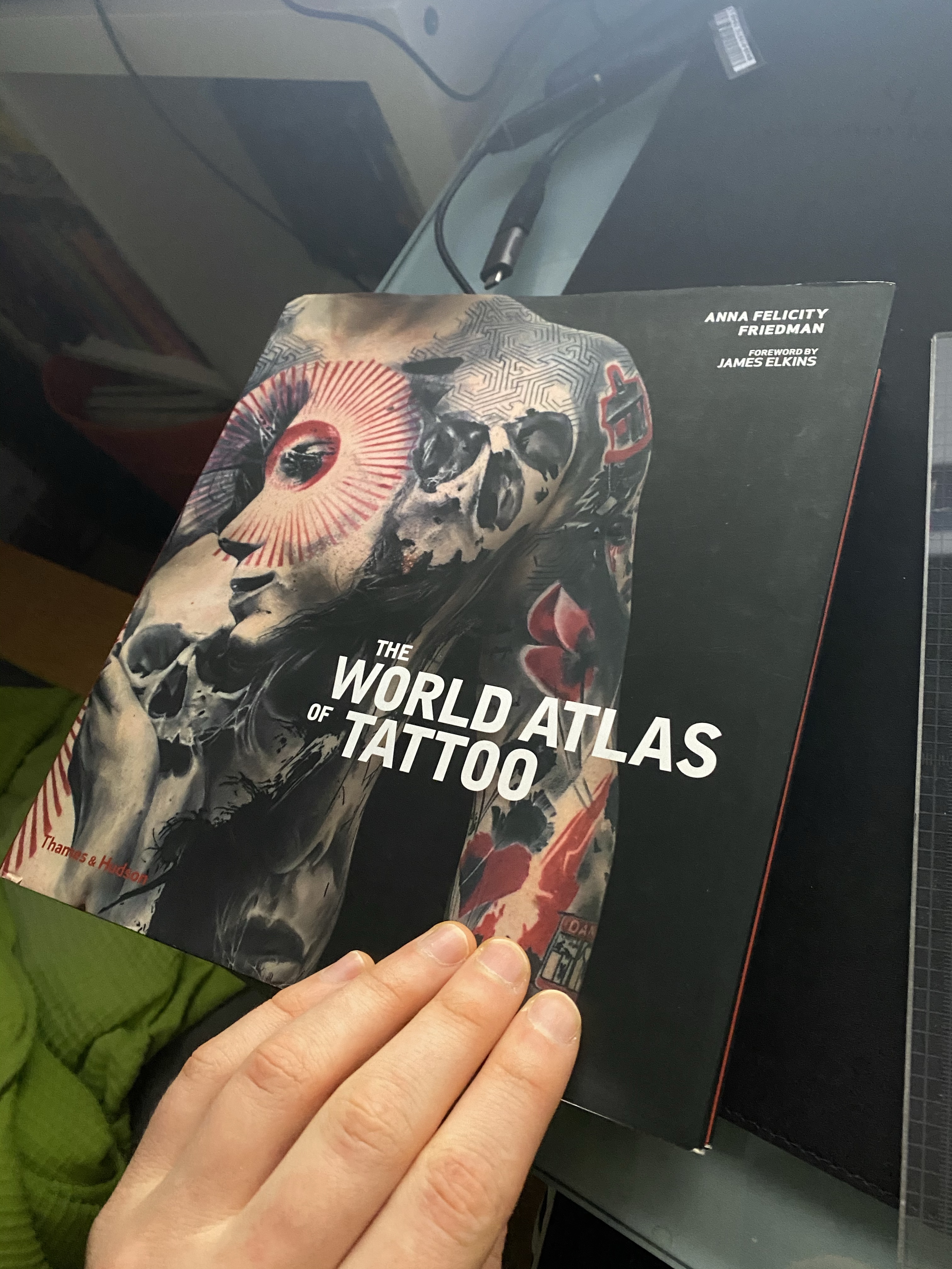 Next I looked at The World Atlas of Tattoo by Anna Felicity Freidman by the publisher Thames & Hudson. This book is a square-ish format, relatively large at 24×23 cm. It is a heavy and thick. As a coffee table book I think the size needs to be slightly larger but not too large. If we think about the purpose of the book it would be something one flips through while at someone’s house as a guest and waiting for the host to serve up cocktails or for the other guests to arrive. It is a conversation piece and is something that could be considered a communal viewing experience. I can also imagine this particular book would be a prefect addition to the waiting area of a tattoo parlour.