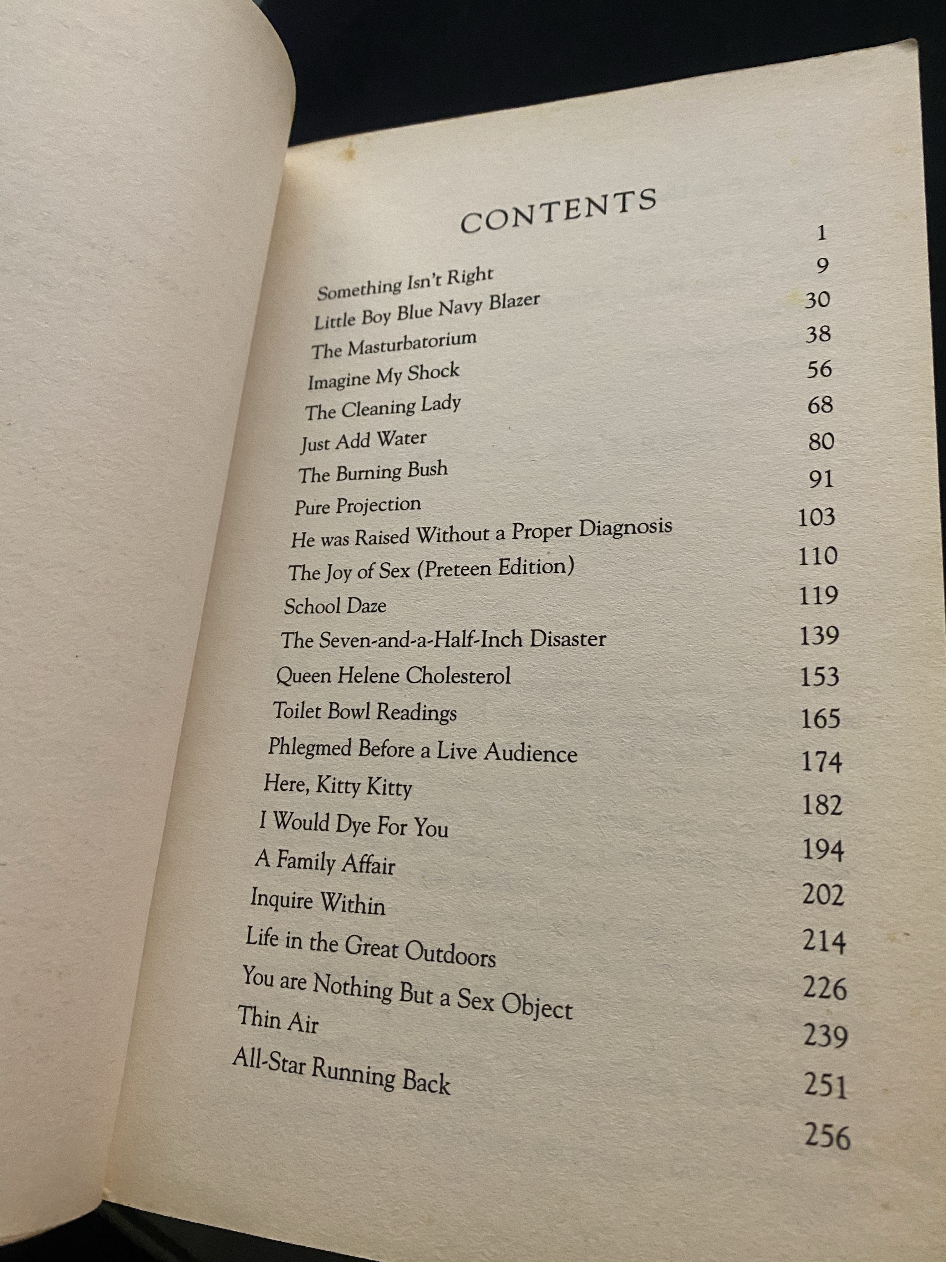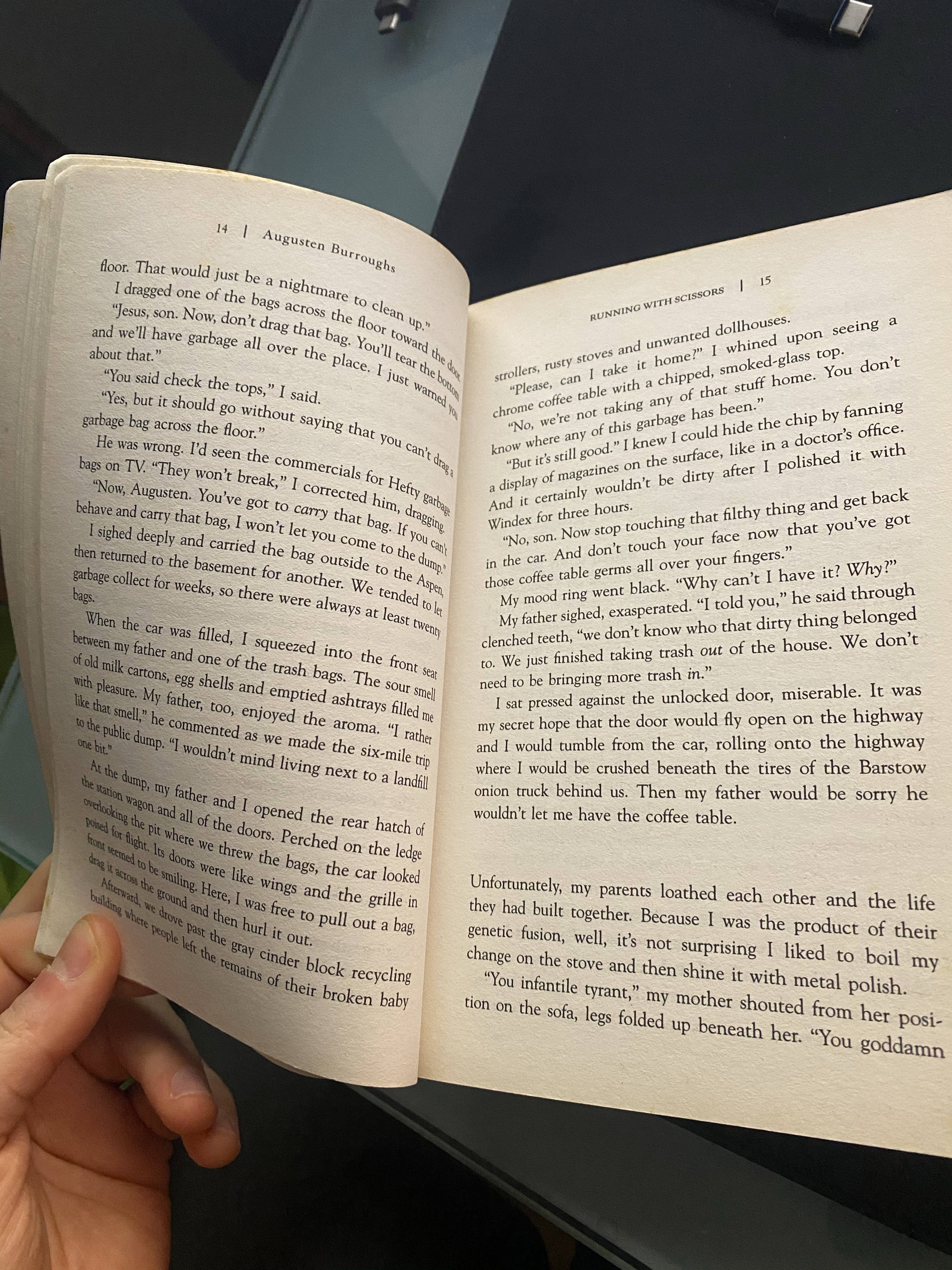 Augusten Burroghs’ Running with Scissors is a memoir style novel. It is a soft cover book is about 20×13 cm in dimensions. The book has no fancy features, it is basically made so it can be folded open with one hand to make it easy to read and carry with you to read it on the go. It is just over 300 pages but thanks to the thin and light (probably recycled) paper the book is very light which further aids its portability.