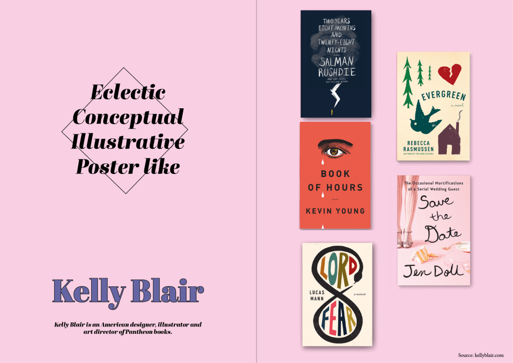 Kelly Blair’s style is quite hard to pin down. She is an illustrator and designer and as such her book covers are full of great illustrations. Her covers are very poster like in comparison with the first few designers that I looked at thus far. Her style is pretty eclectic, so I struggled to put together a spread for her, but here is what I come up with.